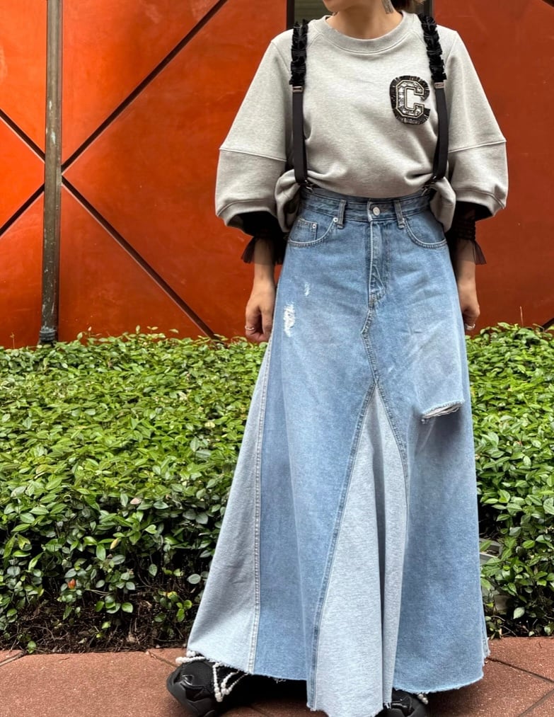 ワードローブに新たなアクセントを加える、クラッシュがポイントのダメージデザインのフレアスカートです。特筆すべきは、フレアーのはぎはこだわりの濃淡でオシャレ、ボリューム感を持たせた魅力的なシルエット。